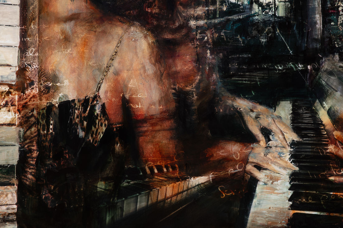 Saint’s creative process, which he calls “Lumadynamic Decomposition”, comes from challenging his own photography. He creates a “Lumascape” which is a composite of multiple photographs printed on linen mesh, this becomes the foundation of the mixed media work.